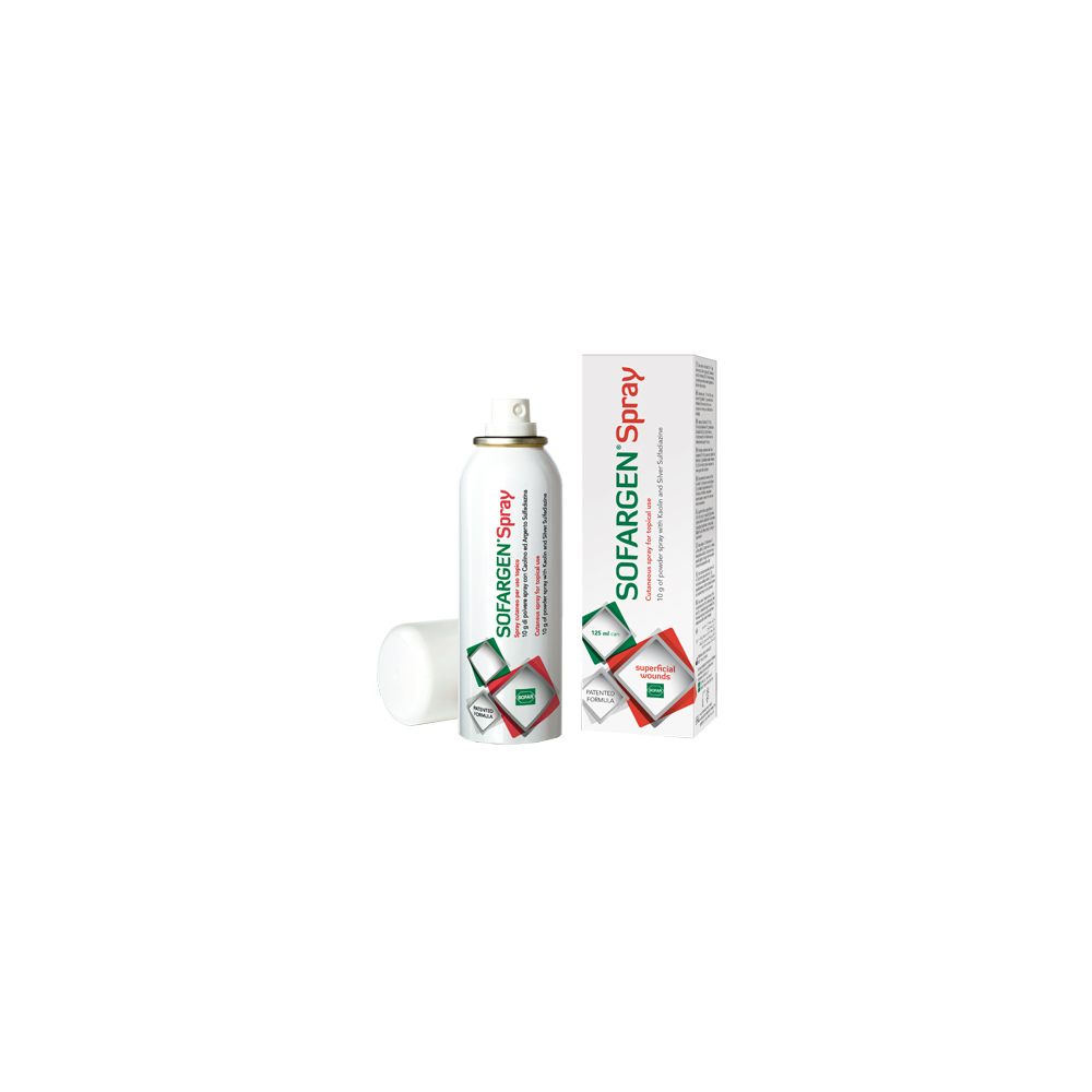 Sofargen spray è una medicazione in polvere spray per uso topico contenente caolino leggero e argento sulfadiazina alla concentrazione dell’1%. Il prodotto rimane agevolmente “in situ” e non è influenzato dallo stiramento dei bordi della ferita. Può essere facilmente rimosso detergendo la lesione con soluzione fisiologica. È indicato per il trattamento locale di lesioni cutanee contaminate di piccole dimensioni quali abrasioni, escoriazioni, tagli, ferite superficiali ed affezioni dermatologiche in genere.