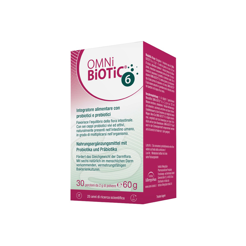 Modalità d'uso Sciogliere 1 misurino raso di OMNi-BiOTiC 6 (2 g) 1-2 volte al giorno in circa 125 ml di acqua, attendere almeno 1 minuto (tempo di attivazione), mescolare nuovamente prima di bere. Si raccomanda di assumere il prodotto a stomaco vuoto.