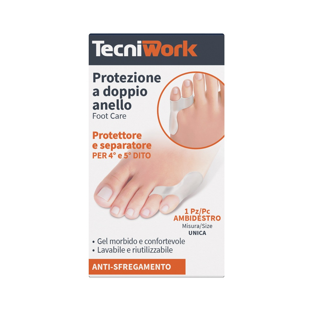 Descrizione Protettore e separatore per 4° e 5° dito a doppio anello in morbido gel. Protegge il 5° dito dalla scarpa e lo separa dal 4°. Protegge le dita, allevia il fastidio e garantisce il corretto allineamento senza creare ingombro. Dispositivo medico lavabile e riutilizzabile.
